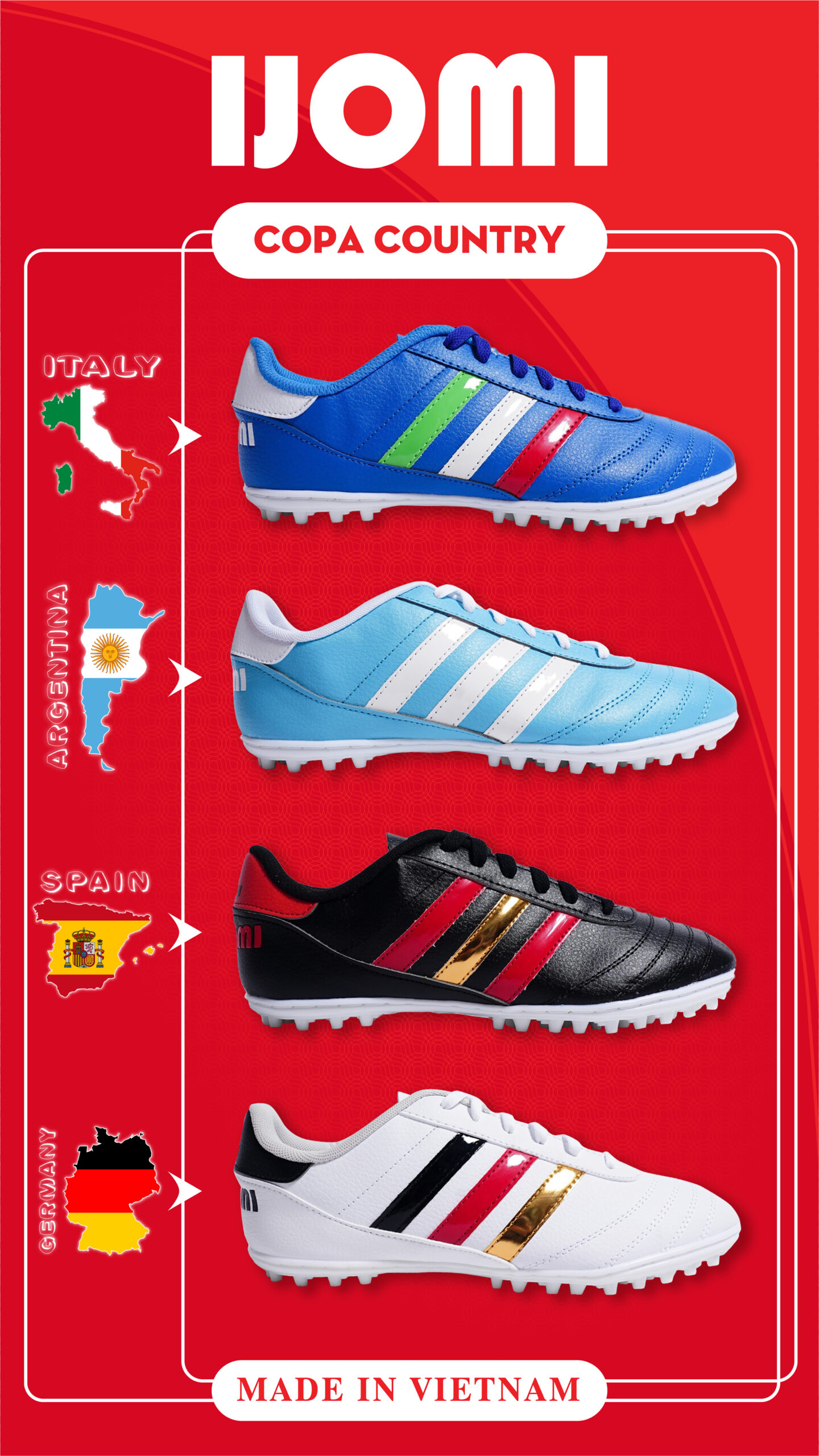 Giày đá bóng IJOMI 3 sọc Copa thuộc dòng đế TF, cổ thấp, bám sân tốt và ôm chân phù hợp với các hoạt động tập luyện và thi đấu bóng đá trên sân cỏ nhân tạo. Thiết kế phù hợp bàn chân người Việt. Kiểu dáng thời trang. Giá thành bình dân, phù hợp với mọi đối tượng.